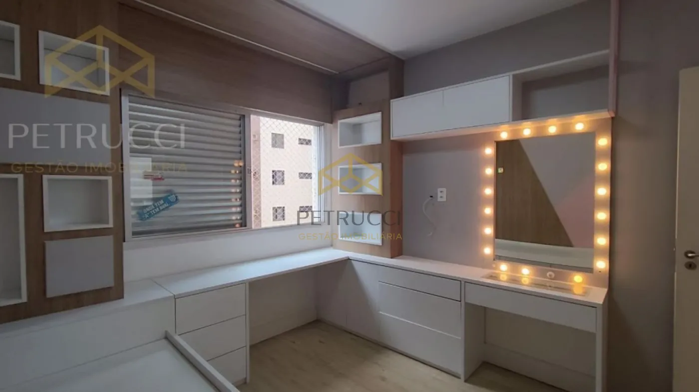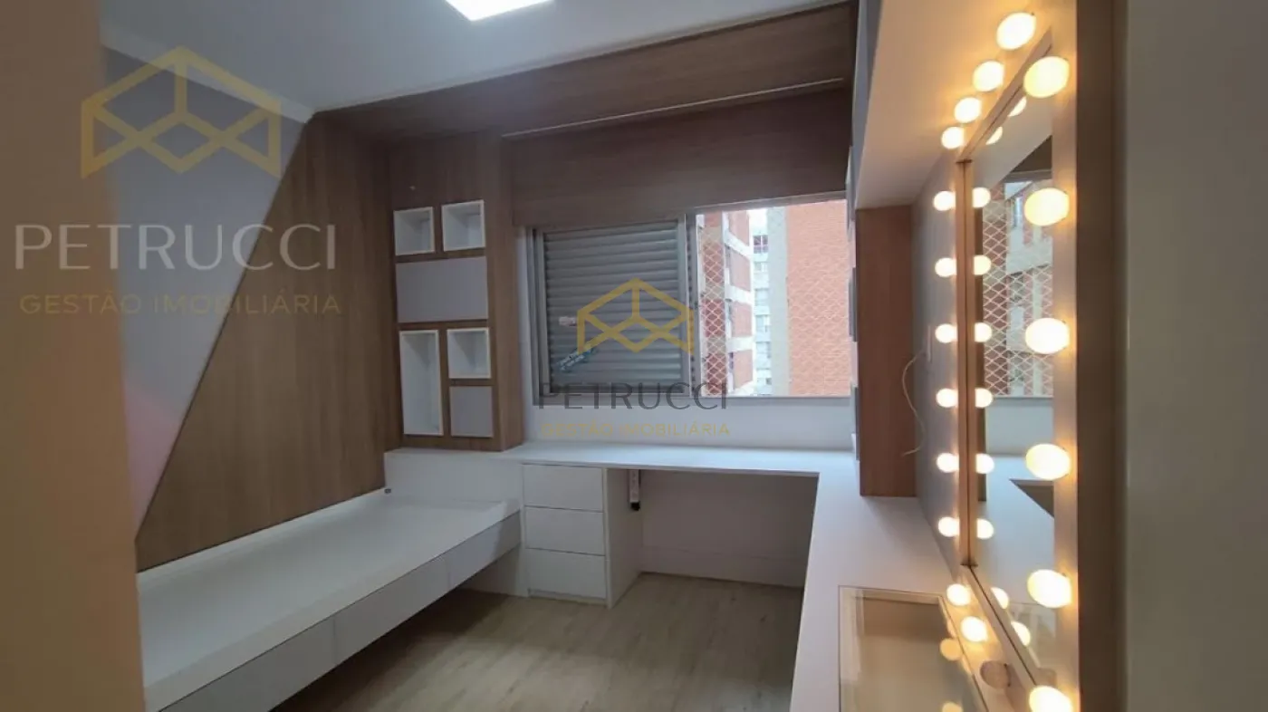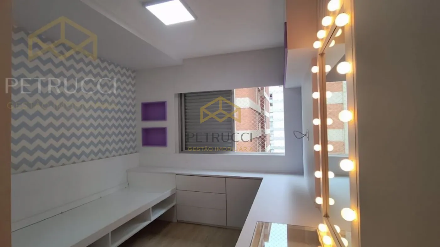 Amplo apartamento com 115m² de área útil, na melhor e mais cobiçada localização de Campinas. Esse belo imóvel dispõe de 3 dormitórios, sendo 1 suíte, living para 2 ambientes ricos em planejados e iluninação em led, banheiro social, escritório, cozinha planejada e área de serviço com banheiro. Aquecimento a gás. O apartamento ainda ainda oferece 2 vagas de garagem cobertas independentes. Sol da manhã. O Condomínio possui brinquedoteca, playground, churrasqueira, academia e salão de festa. Portaria 24horas.
