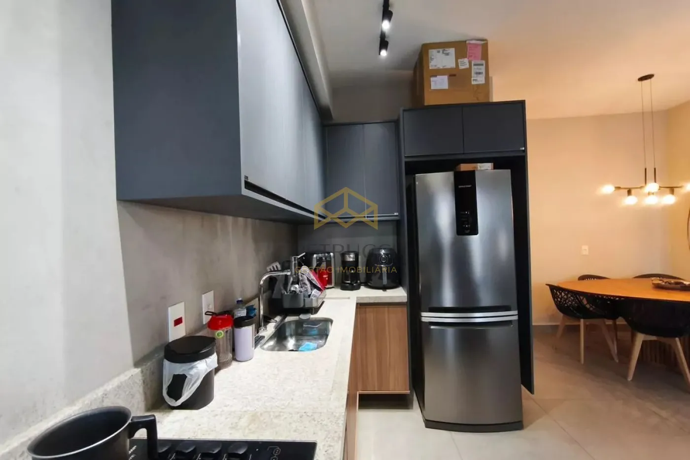 A cozinha é equipada com fogão cooktop e forno embutidos Brastemp. A sala ainda dispõe de um mobiliário home-office, perfeito para quem precisa de um espaço funcional para trabalhar. O porcelanato Portobello, instalado em todo o interior do apartamento, acrescenta sofisticação e facilidade na manutenção. A iluminação foi projetada com luminárias em trilho, criando um ambiente moderno.