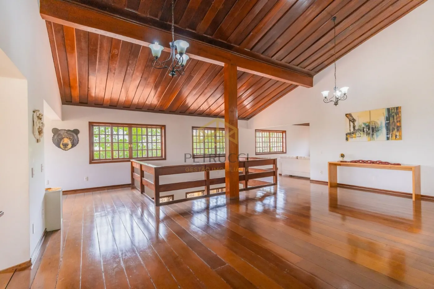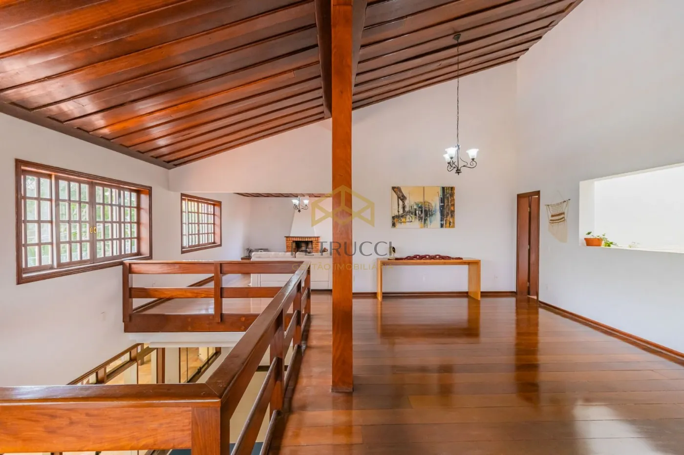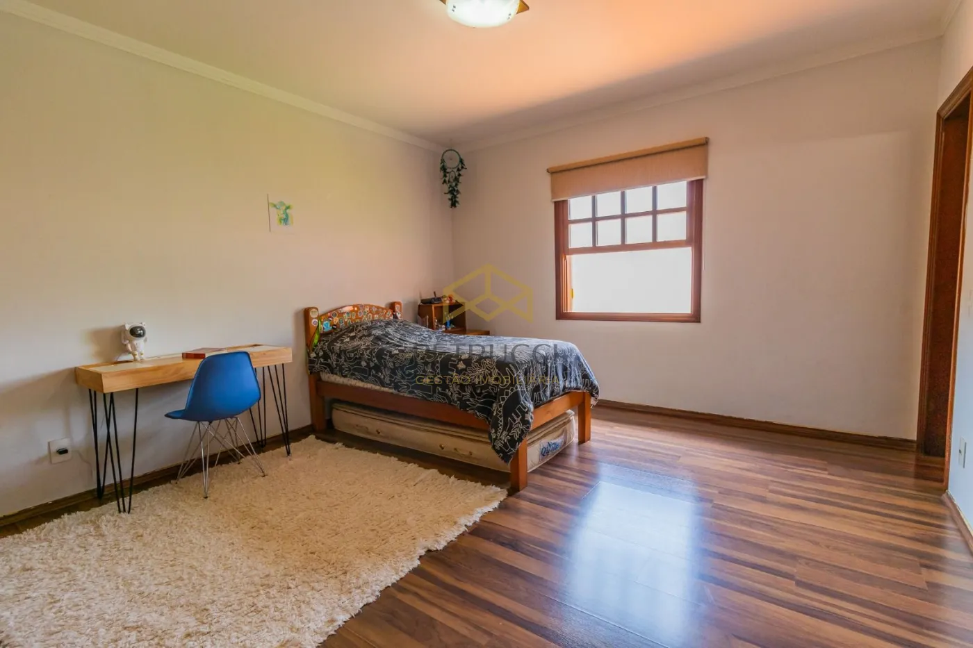 A residência conta com 4 dormitórios, sendo 3 suítes, além de cinco salas que podem ser utilizadas como estar, jantar, TV e convivência. A suíte principal dispõe de closet, sala de banho com hidromassagem e sauna. O mezanino, com pé-direito duplo, integra escritório e lareira, criando um espaço reservado e funcional.