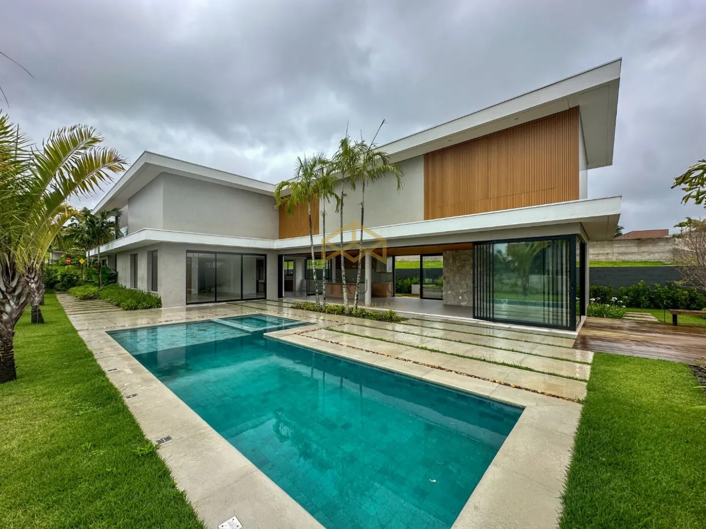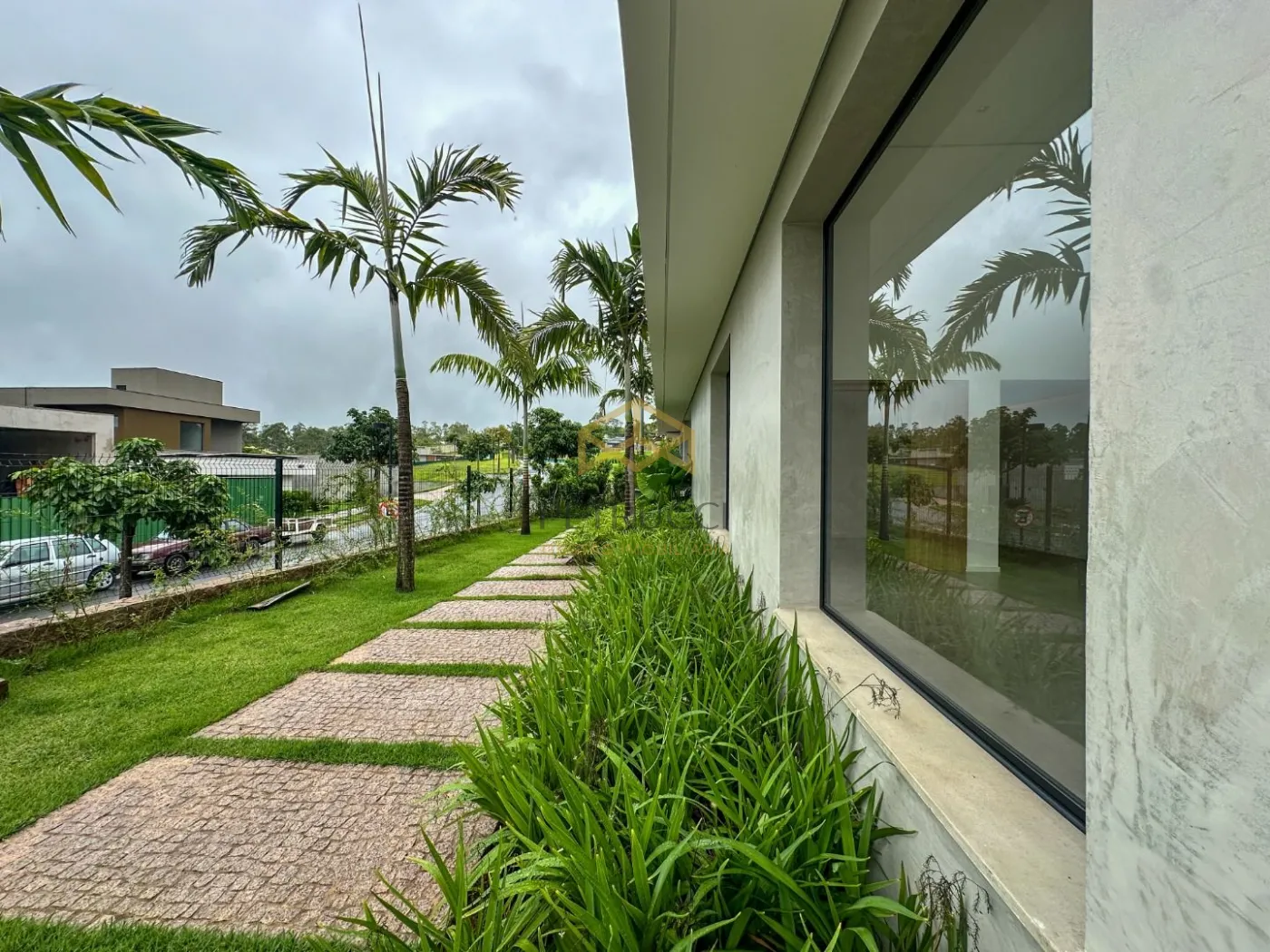 No térreo, você encontra uma garagem espaçosa que acomoda 3 carros cobertos e 3 descobertos, com acesso direto a duas áreas de depósito. A garagem também possui porta para o corredor externo de serviço e acesso interno para a lavanderia e cozinha. A entrada principal é marcada por uma imponente porta dupla de madeira maciça, que leva ao hall de entrada. O jardim frontal, sem muros, e o jardim lateral, que margeia uma rua sem saída, oferecem acesso isolado à área de lazer da casa. O interior da residência conta com um living para 3 ambientes (sala de estar, sala de jantar e home theater, uma adega charmosa, sala de lareira, solarium, e um home theater integrado. O espaço de jantar é complementado por uma sala de almoço e uma louçaria, além de uma cozinha totalmente planejada com despensa. A área de serviço inclui lavanderia interna, dependência completa para empregados, depósitos e uma área de serviço externa com horta elevada e telada.