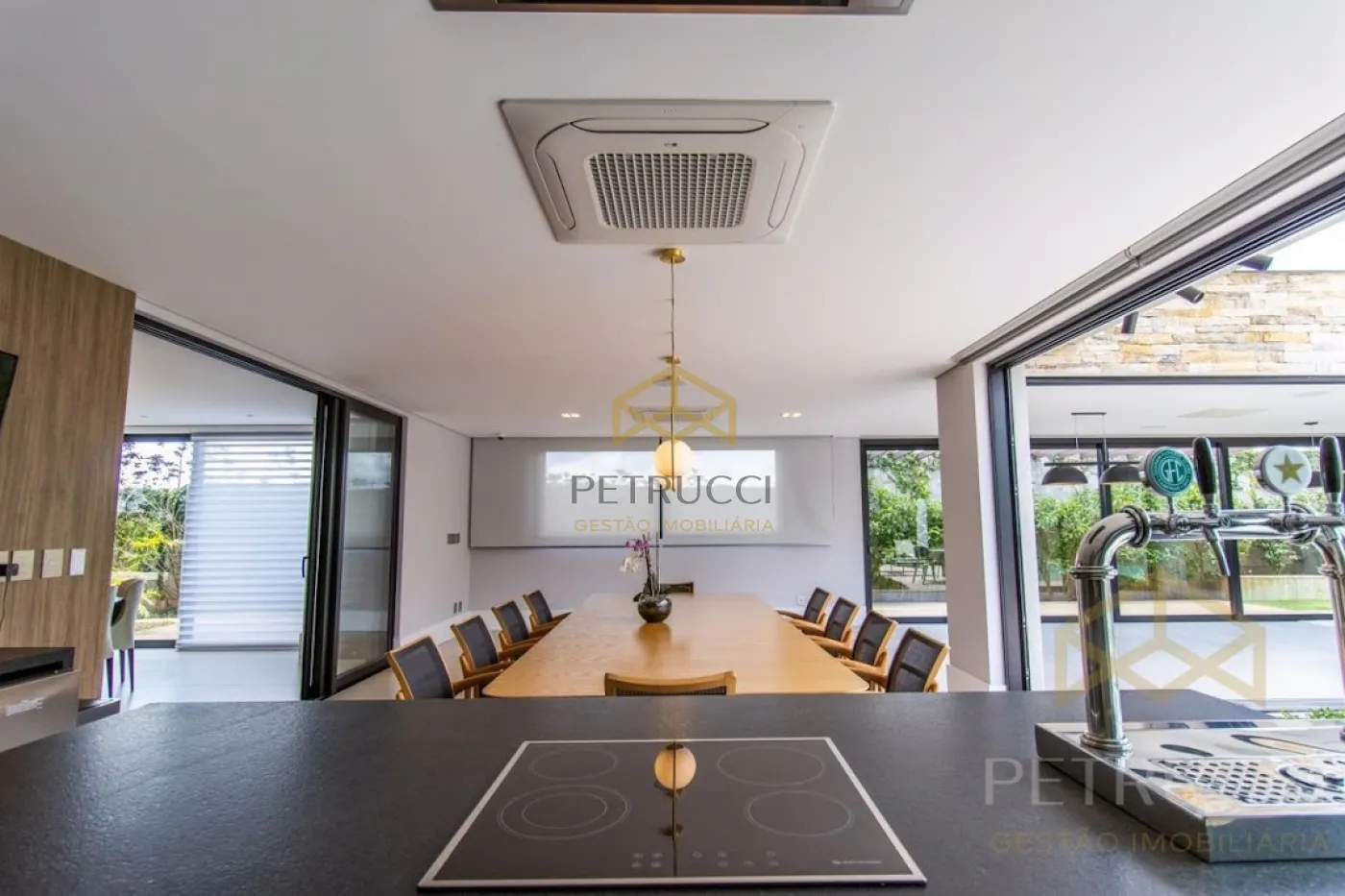 Casa espetacular localizada em condomínio de altíssimo padrão em Sousas, Campinas. Sobrado com arquitetura moderna, paisagismo encantador, completo em planejados e com área de lazer espetacular. Conta com 4 suítes, sendo 1 master e 1 térrea completa para hóspedes. Além de living amplo e com pé-direito duplo, a residência possui home cinema no pavimento térreo e sala de TV no pavimento superior. Ambientes integrados proporcionam muita iluminação natural. Lazer privativo com paisagismo diferenciado, com piscina, sauna e espaço gourmet amplo com churrasqueira, cooktop por indução e chopeira. Casa totalmente automatizada e com elevador. Acabamentos e revestimentos de altíssimo padrão.