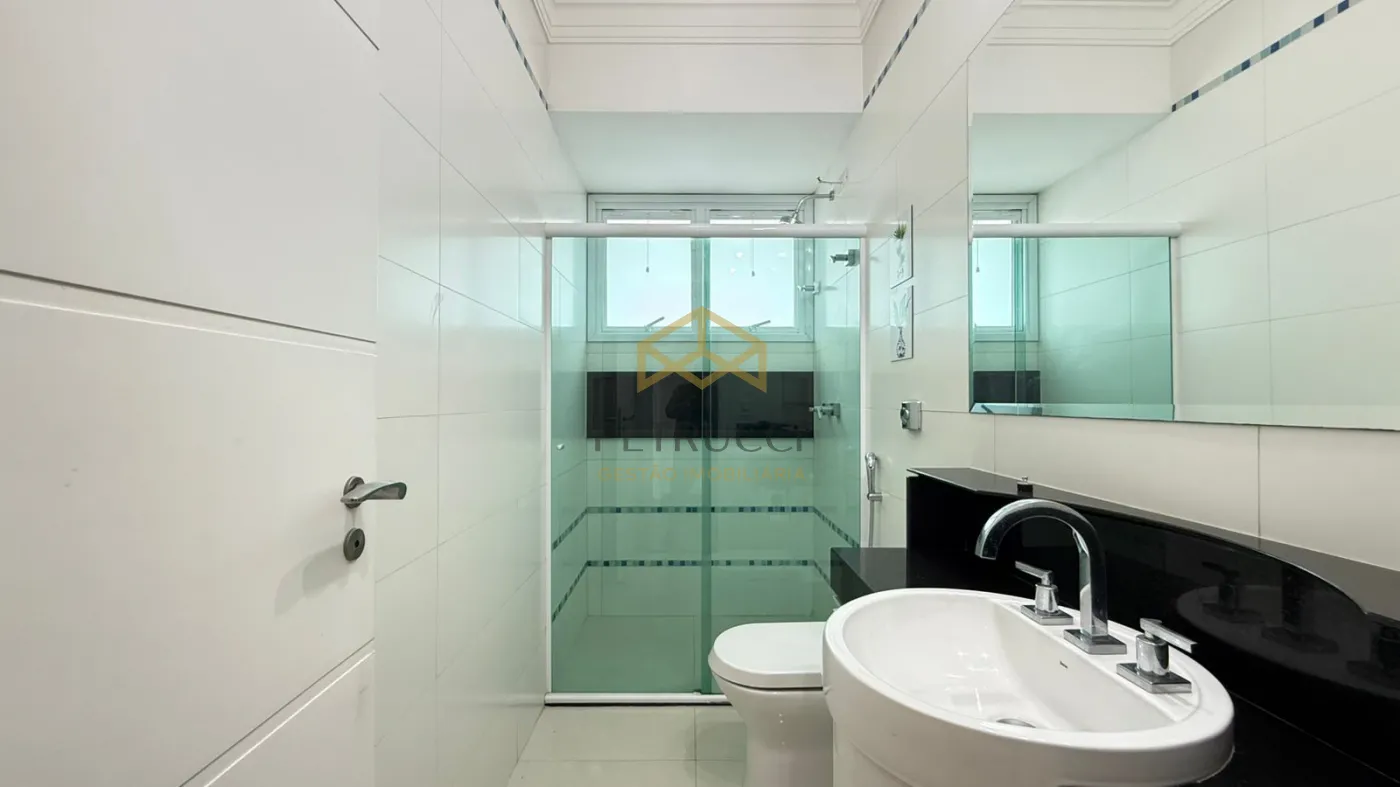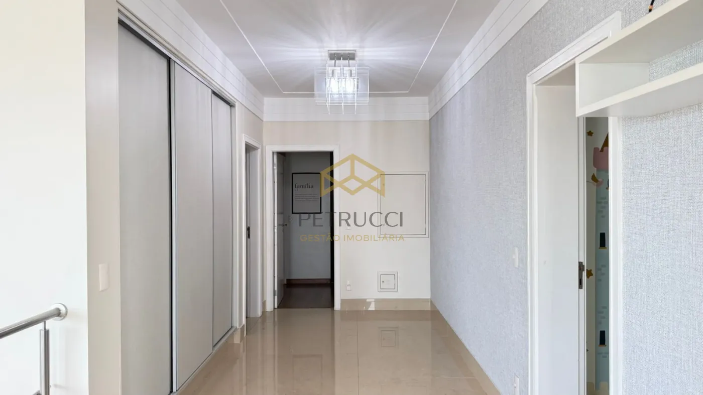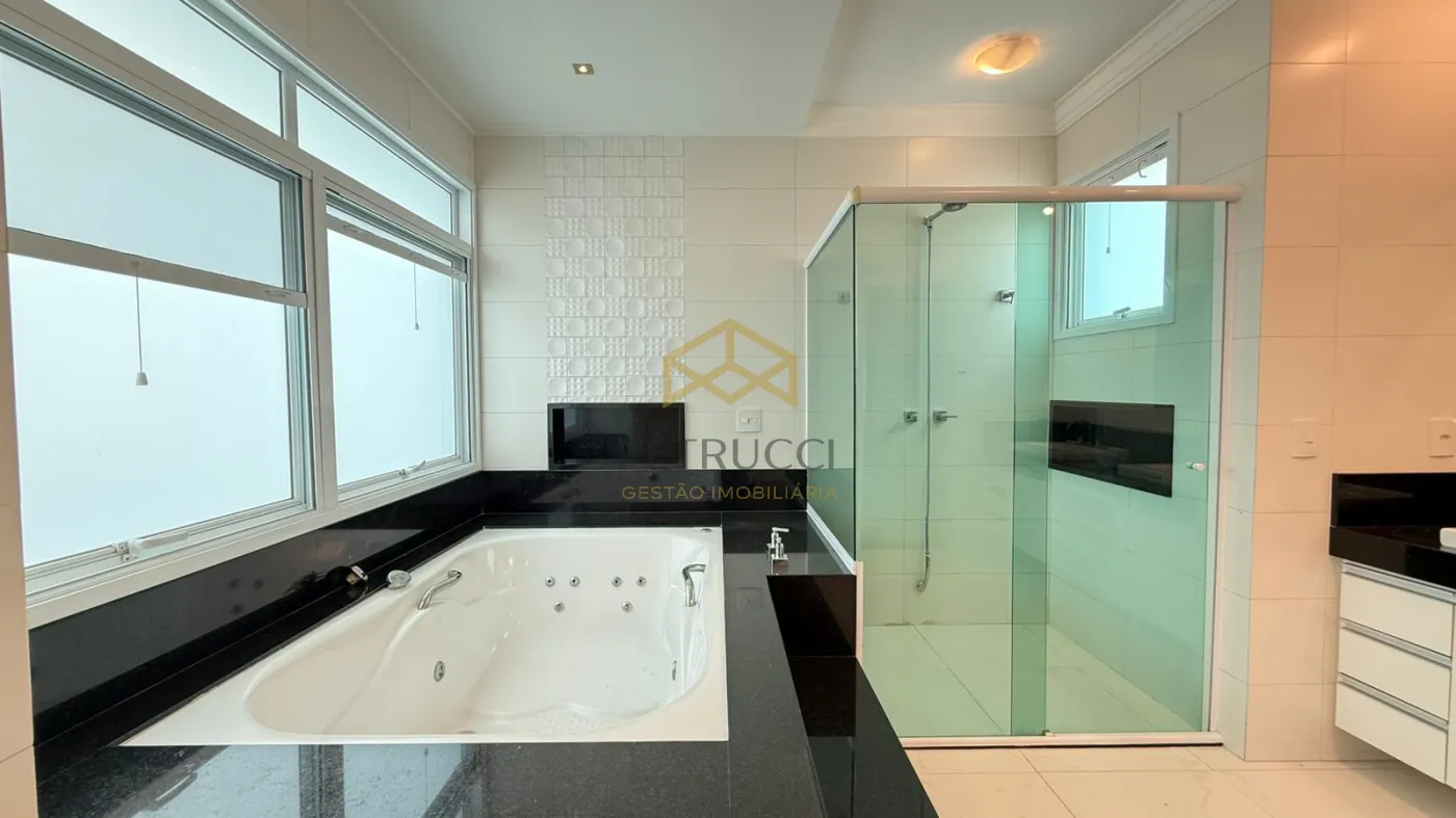 No piso superior há um hall com roupa-ria ligando as 4 suítes. Os 2 suítes enormes do fundo, espelhados, com enorme sacada os integrando. A suíte de hóspedes possui banho híbrido (elétrico ou boiler) com sacada frontal interligada com a suíte master. O suíte master é enorme e possui closed duplo e uma sapateira para mais de 300 pares de sapato e banho com cuba dupla e hidromassagem.