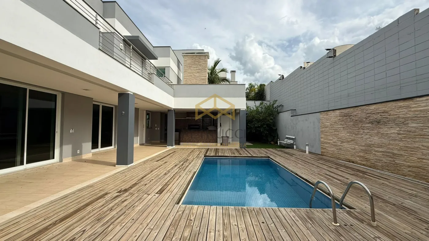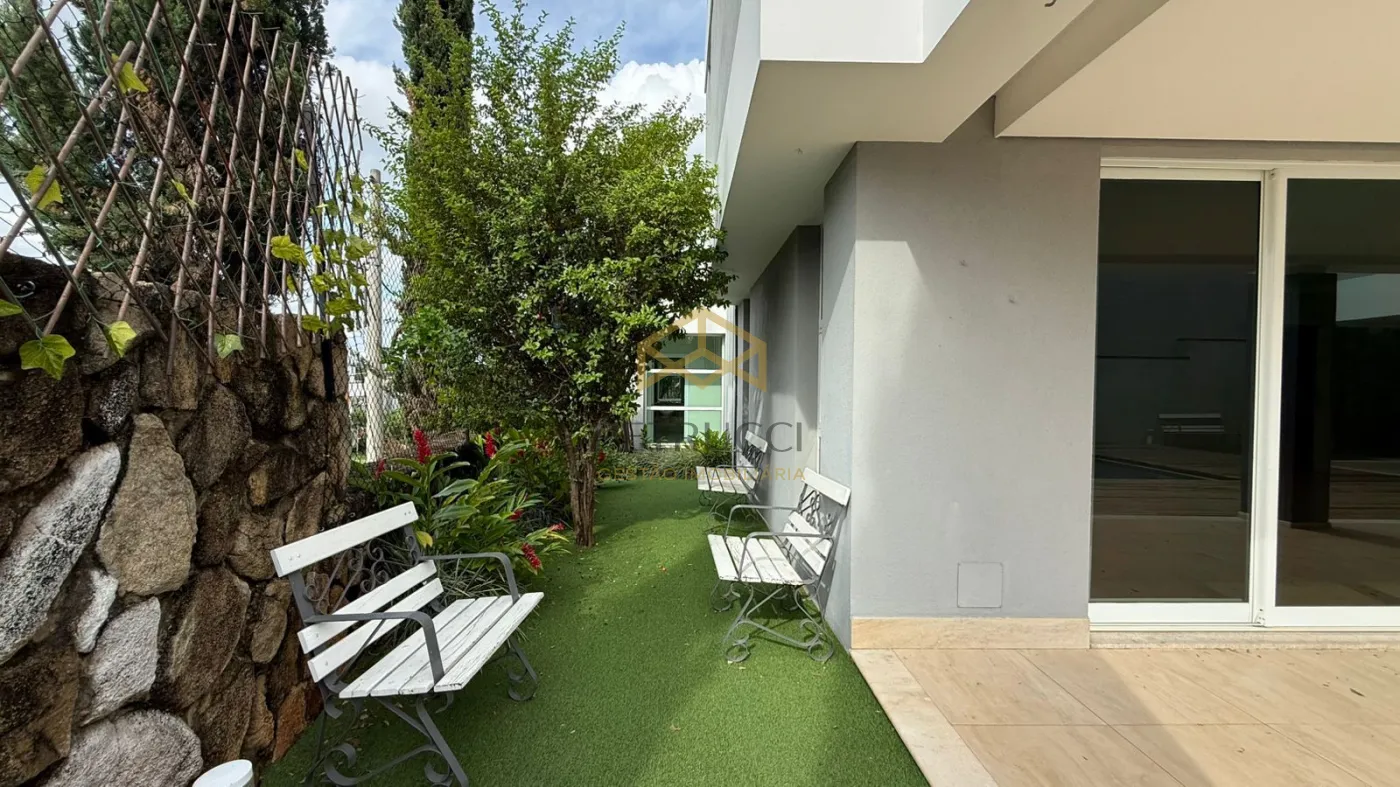 No piso inferior, piscina aquecida (independente) com banheiro, área gourmet com churrasqueira e forno de pizza, integrada com ampla cozinha. Uma oficina no fundo e algumas árvores frutíferas (romã, amora, jabuticaba e acerola). Lavanderia e despensa para alimentos com entrada independente acessando a cozinha. Salas de estar e jantar integradas ao hall principal com pé-direto duplo e com lavabo. Home Theather e Escritório monstro independentes.