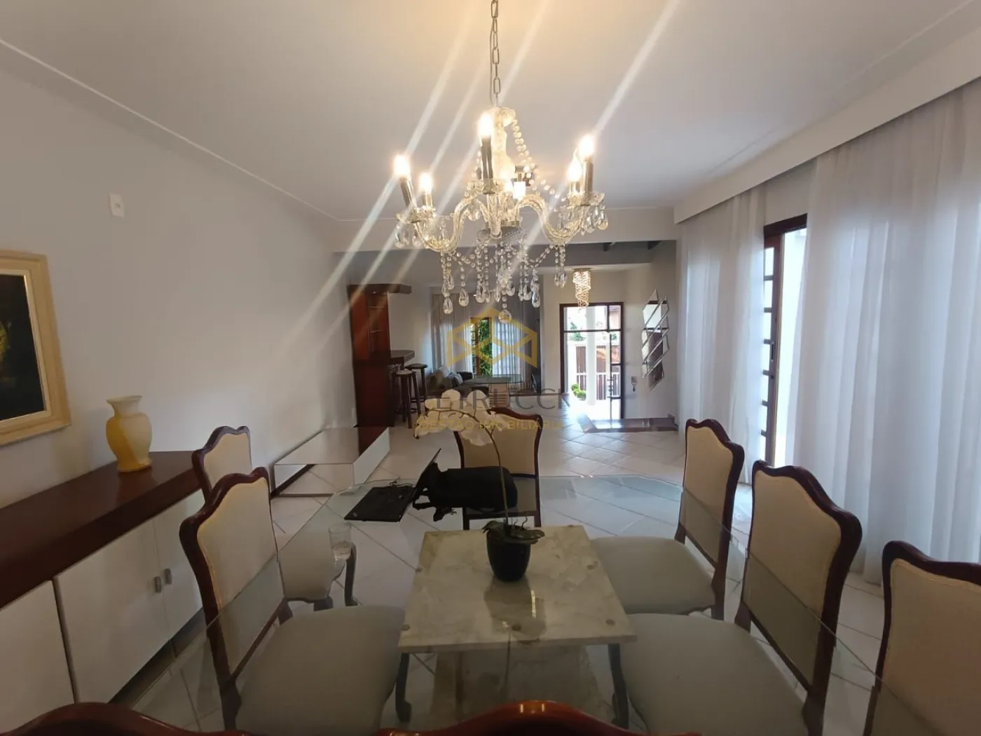 Living em desnível para 3 ambientes, sendo todos bem decorados, sala de tv, rack com iluminação e um belo sofá retrátil, ampla sala de estar com belíssimas cortinas e uma deslumbrante e completa sala de jantar com mesa quadrada 8 lugares tampo de vidro e base em mármore, cadeiras, buffet em madeira e lustres cristal, espaçosa cozinha planejada incluindo mesa para almoço de 6 lugares, ampla dispensa, área de serviço e edícula planejada com banheiro.