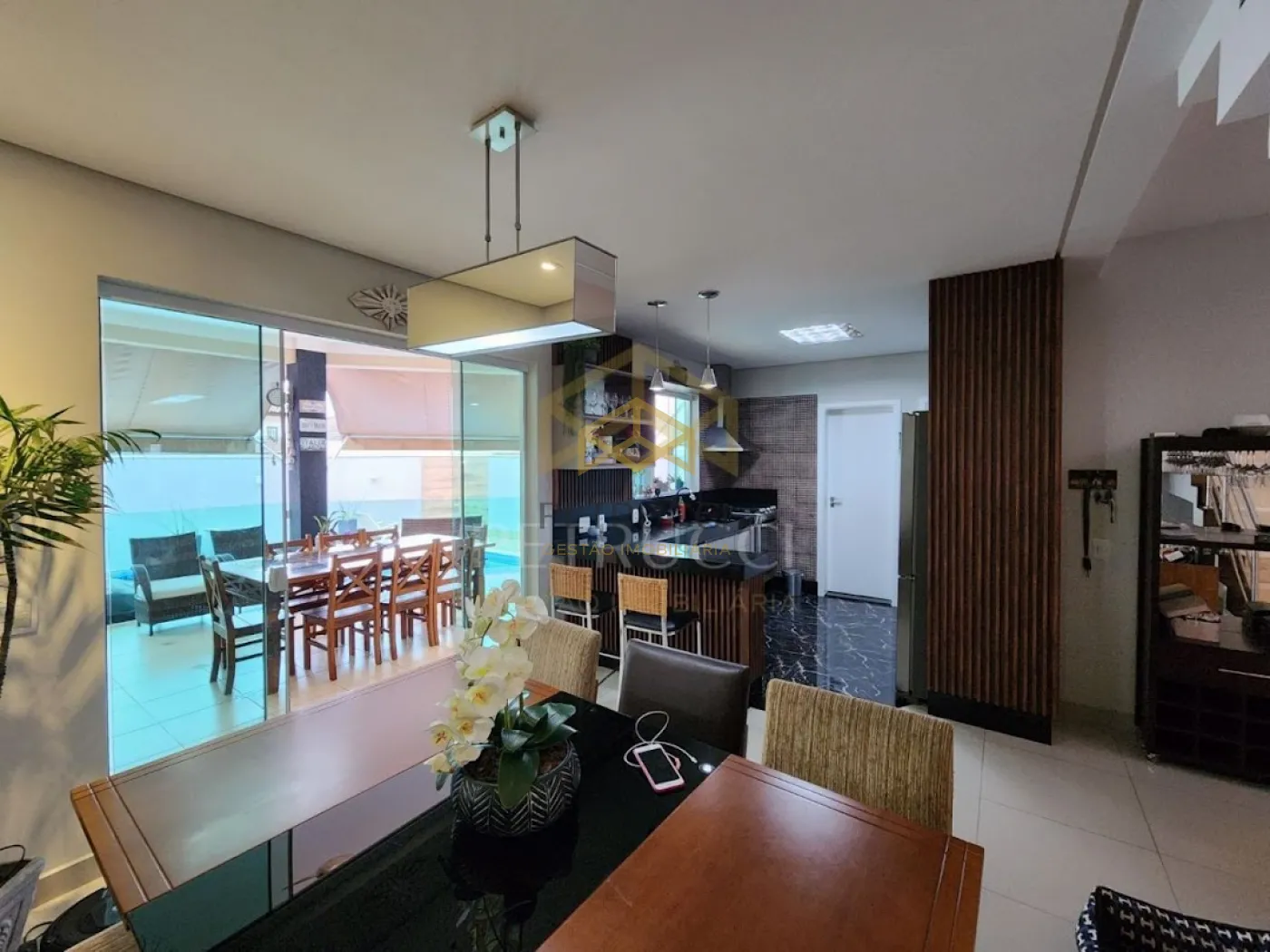 Excelente sobrado com 3 dormitórios com armários sendo 1 suíte com closet e varanda e os outros dormitórios com terraço e banheiro social no piso superior. Piso térreo com living com pé direito duplo, escritório, lavabo, sala de jantar e cozinha americana planejada com fogão embutido, coifa e despensa. Área gourmet com churrasqueira e quintal com piscina. Lavanderia coberta. Aquecimento solar e energia fotovoltaica. 4 vagas de garagem sendo 2 cobertas. Portaria e segurança 24h. Lazer com quadra poliesportiva, salão de festas, churrasqueira, paisagismo, playground e muito verde para fazer ótimas caminhadas.