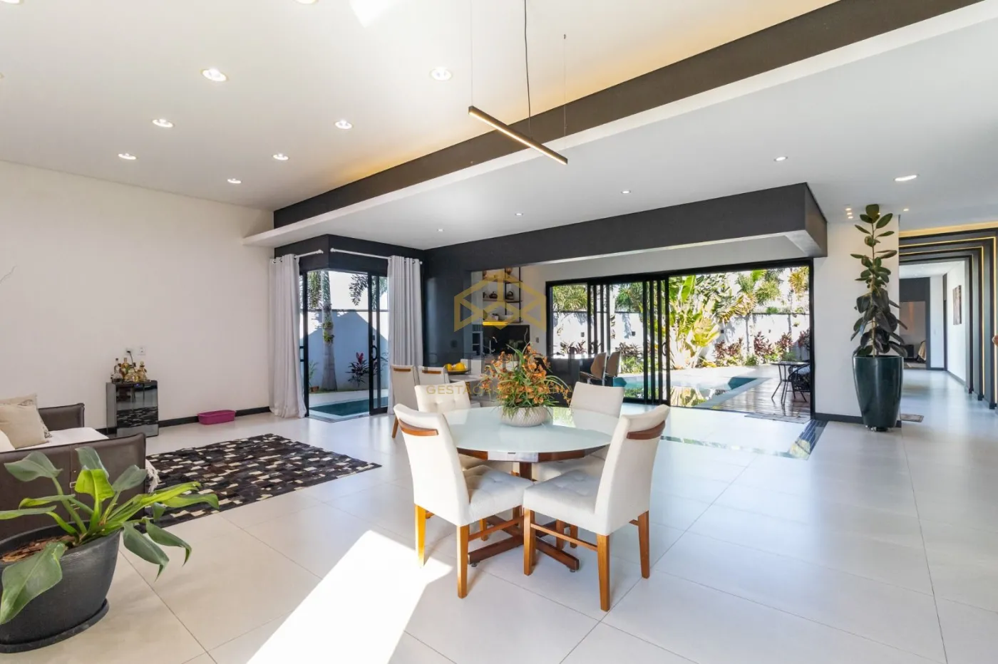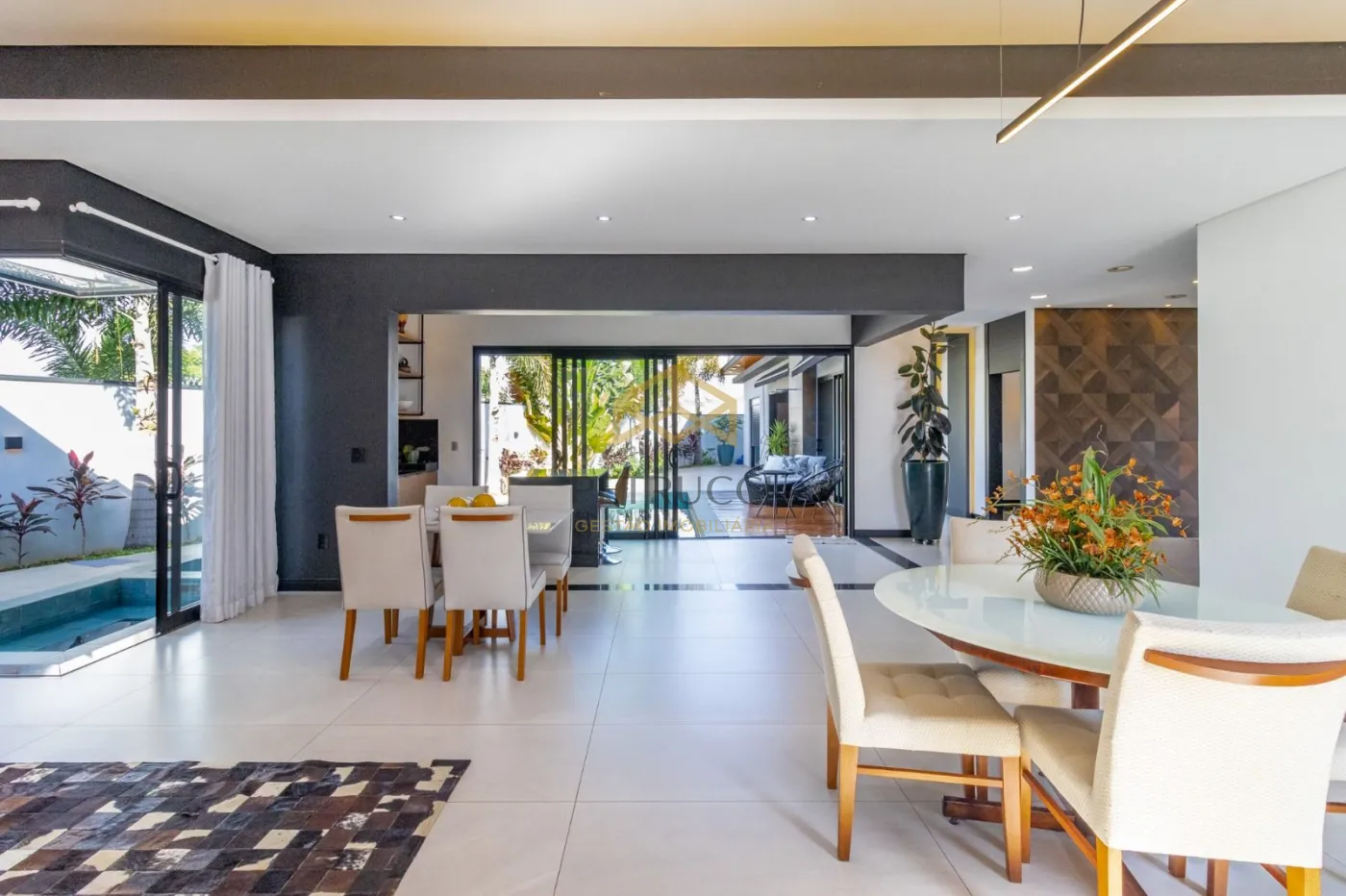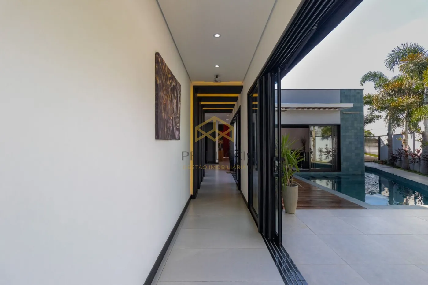 O imóvel possui 3 suítes todas com closet e persianas automatizadas com controle remoto, escritório para home office com ponto de ar condicionado, lavabo, sala de estar, jantar, cozinha em ilha totalmente integradas, dois pontos de pia, sendo um na ilha, uma área gourmet com churrasqueira e bancada em mármore, totalmente moderna e sofisticada integrada com os outros ambientes, piscina com hidro e iluminação no controle remoto, lavanderia, fachada imponente, porta pivotante com fechadura eletrônica, iluminação em LED em todo o imóvel, piso porcelanato retificado, garagem para até 4 veículos, sendo 2 cobertas e 2 descobertas, acabamentos do teto amadeirado, possui entrada independente pelo corredor externo, uma casa para pessoas e famílias exigentes!