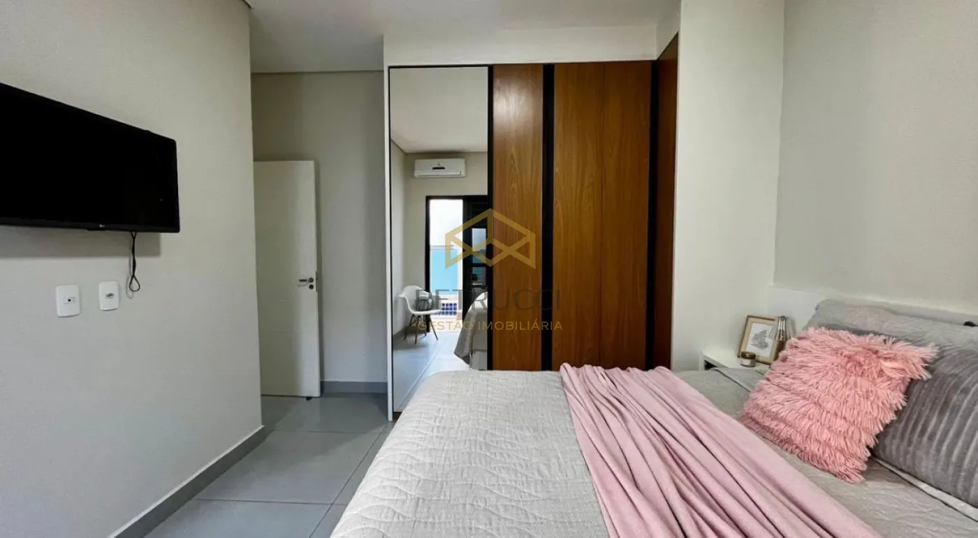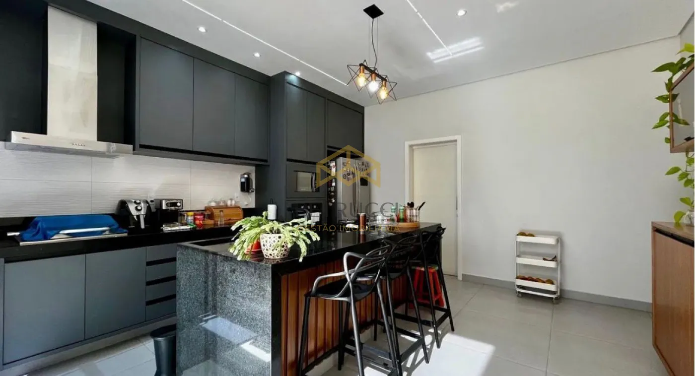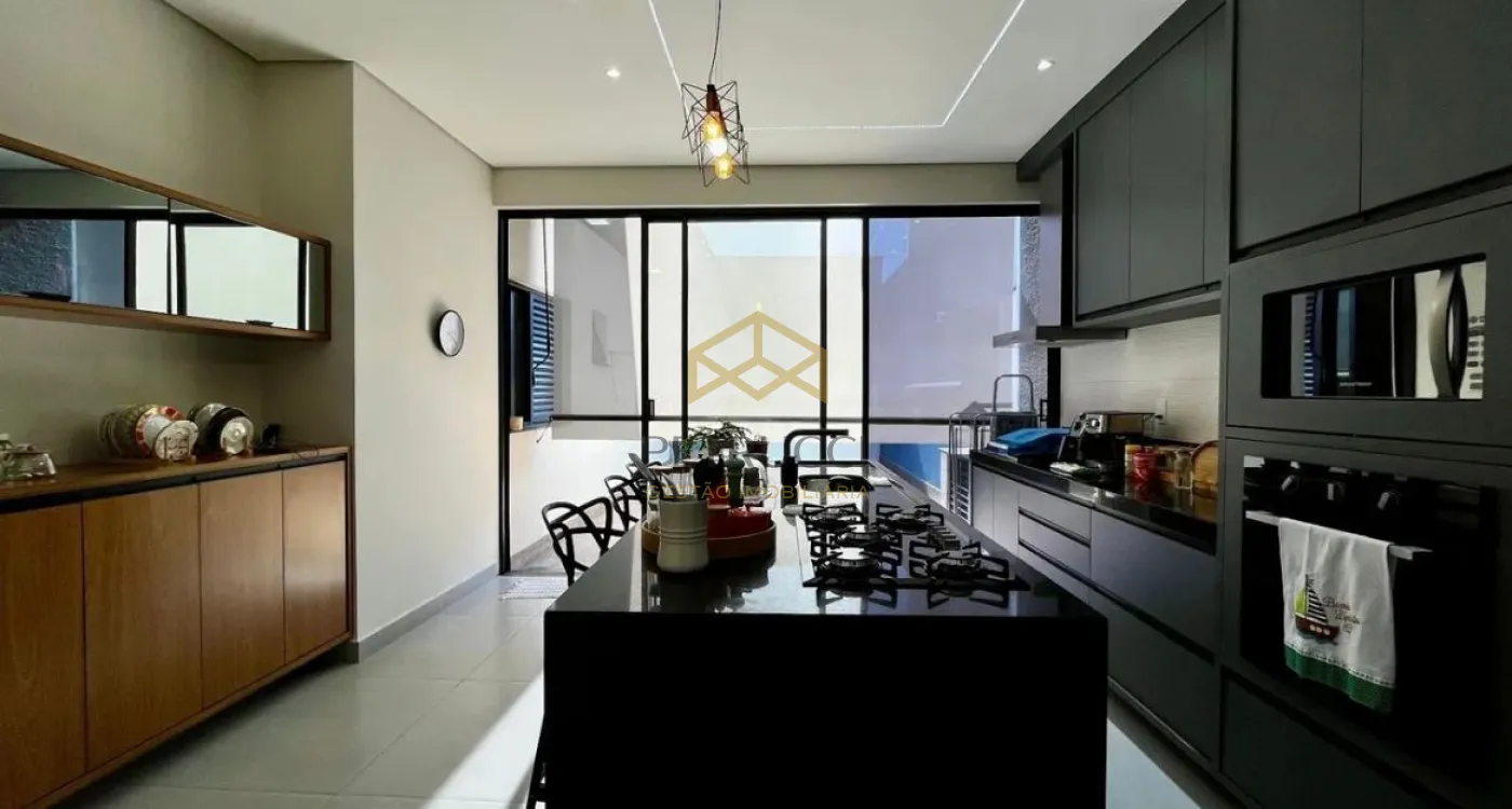 Com 3 suítes com armários, espelhos e box, sendo a suíte master com ar-condicionado e planejados. Sala aconchegante com painel, cortinas e ar-condicionado, integrada à cozinha com armários, cooktop, ilha e churrasqueira a gás.