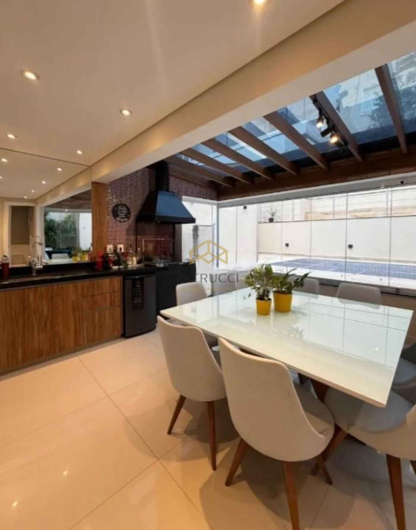 A casa possui lavabo, piso porcelanato, piso vinílico, área de serviço, banheiro empregada, cozinha, cozinha americana, despensa, lavanderia, sacada, duas salas de jantar, Armários na área de serviço, Armários no closet, Armários no banheiro, dormitórios, sala, ar- condicionado, depósito, piscina, Aquecimento de água com energia solar, e churrasqueira.